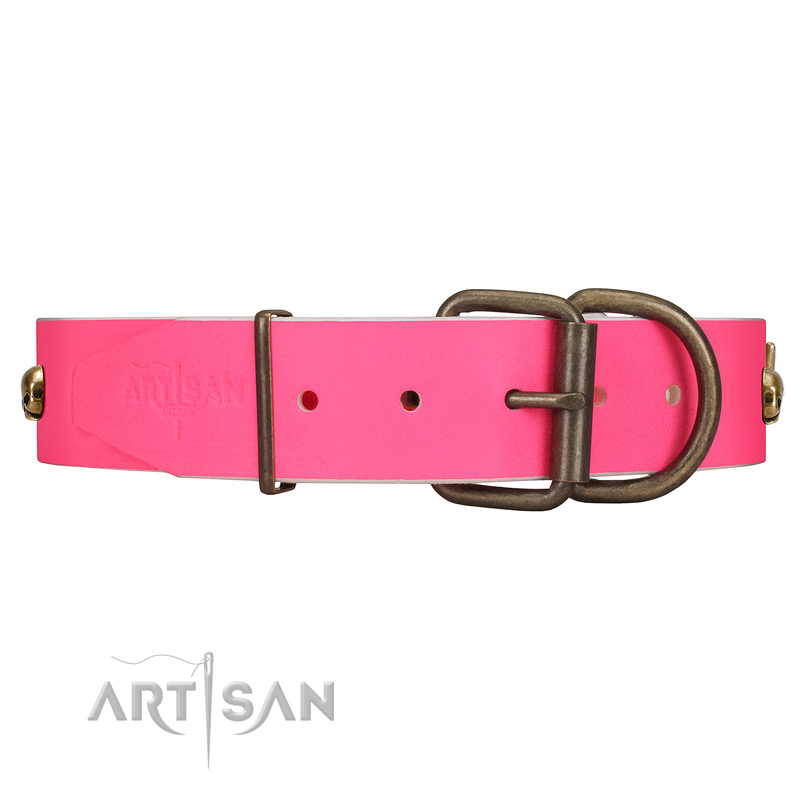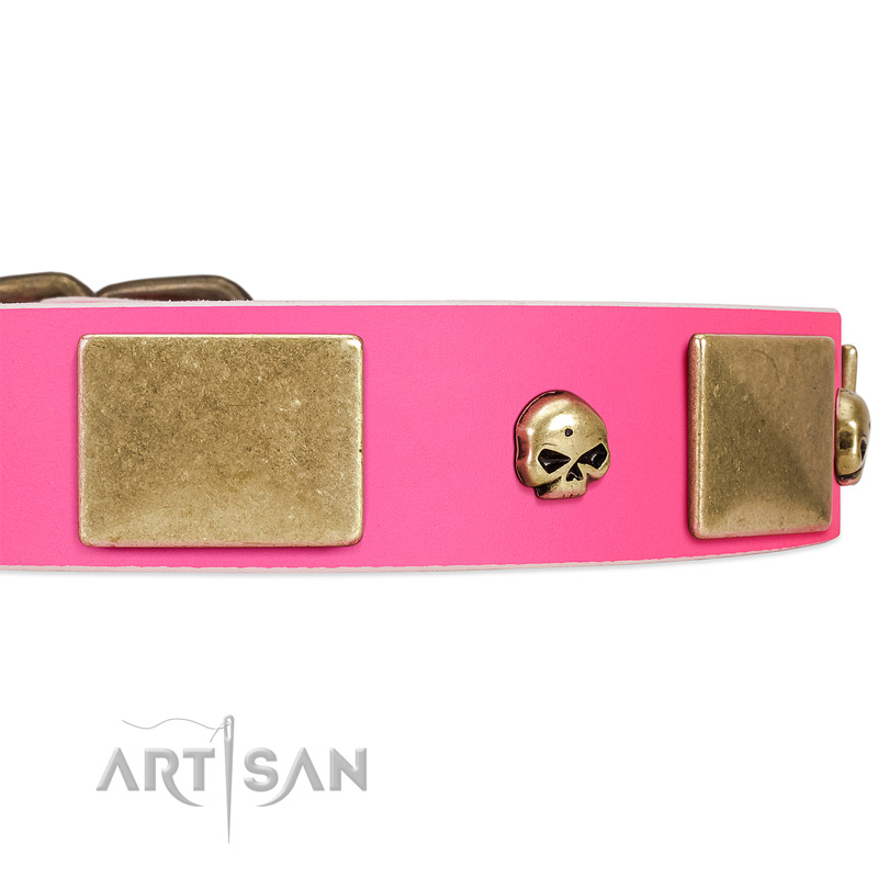 Are you longing for everything unusual? Pay attention to this Exclusive Leather Dog Collar handcrafted by FDT Artisan! Massive plates and skulls carry back to the ancient times of pirate adventures. The old bronze-like covering adds antique spirit of the past. Meant to glamorize the furry lady, this posh pink collar will bring a real triumph to your pet.