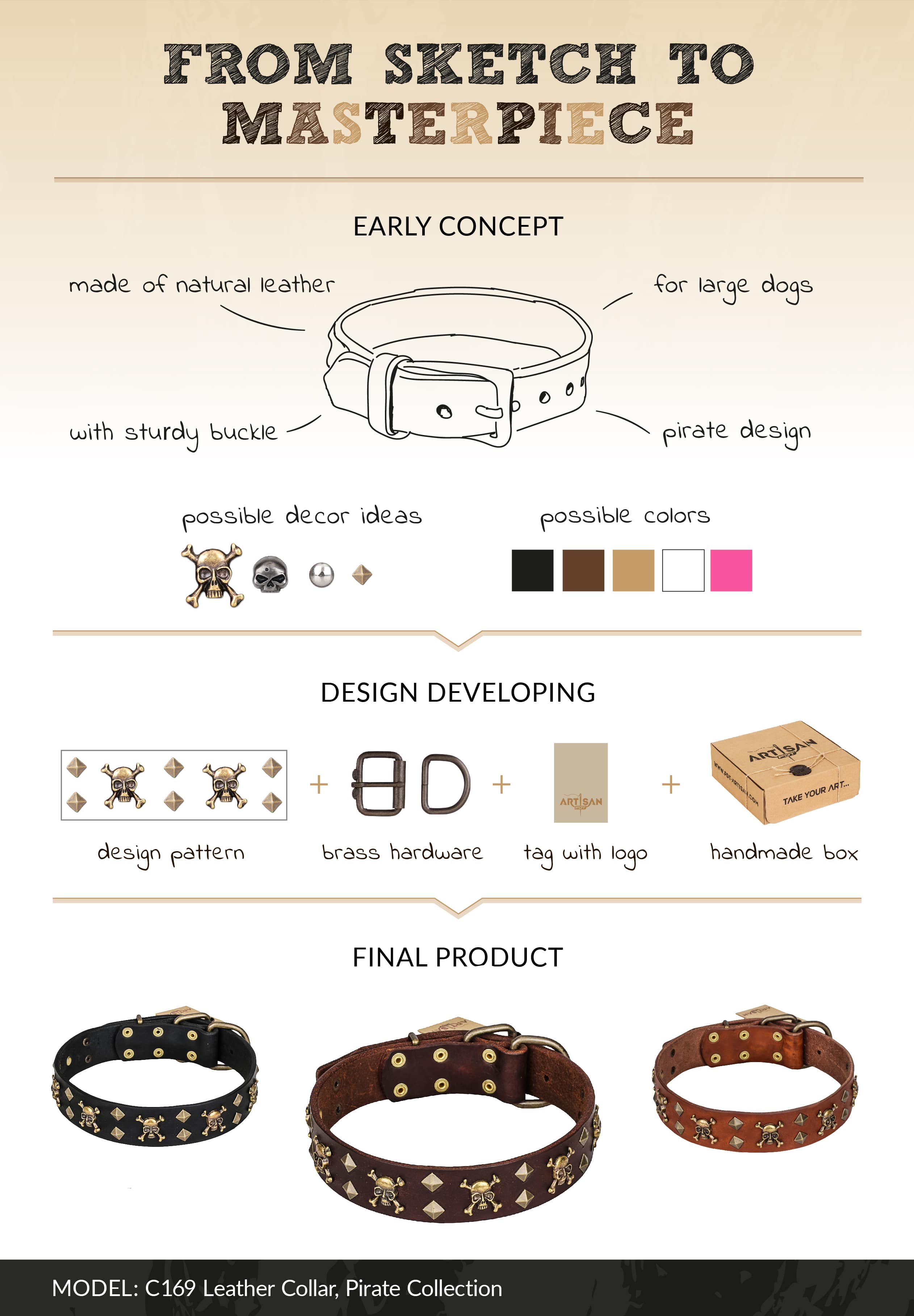 Wearing this Pirate Style Dog Collar, your dog will be a fashion star of your neighborhood. Unique FDT Artizan design makes this collar one of the most desirable dog walking accessories. The mix of tiny skulls and studs looks amazing. They look like an old rich metal and perfectly match each other. This dog supply is available in three colors and you can choose any of them to accentuate individuality and perfect style of your dog.