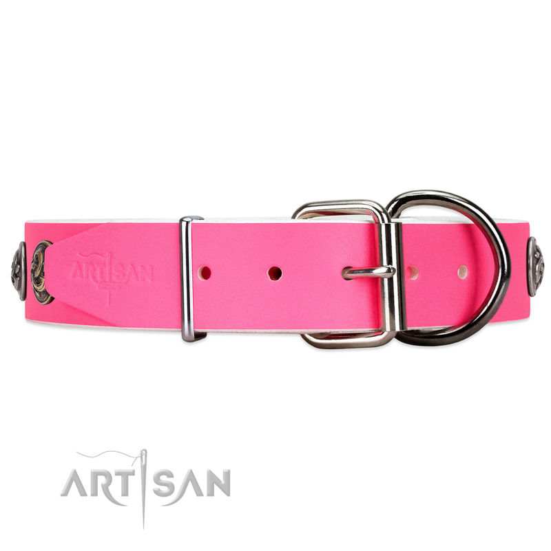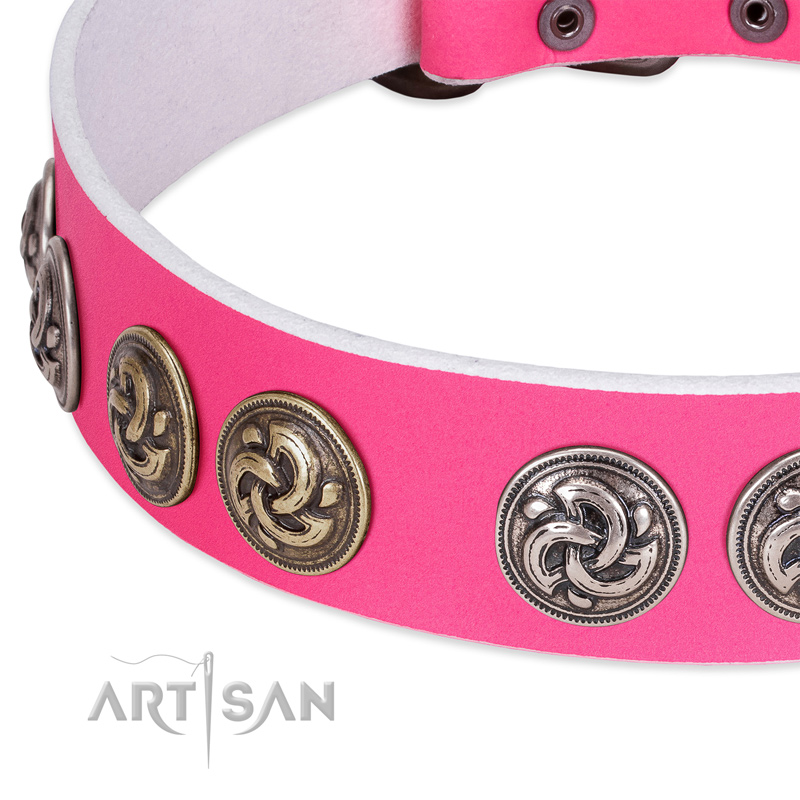 Would you like to please your furry friend? We are sure your pet deserves only the best equipment. Just look at this handmade FDT Artisan pink leather dog collar! It is so stylish and girlish! Round gold- and silver-like studs shine bright like real jewelry. With this collar on your four-legged lady will be in the center of admiration. This fashionable collar will suit for everyday walks and special occasions as well. Be unique with this amazing supply!Click on the pictures to see bigger image