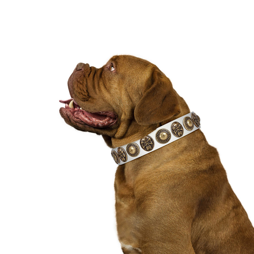 Are you ready to catch jealous sights when you walk your dog? This dog collar special feature is its extravagant design. It will surely attract much attention to your canine. Old bronze plated medallions with skulls and massive conchos look like ancient treasures on snow white leather.