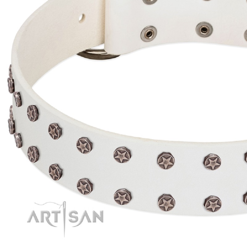 The most incredible detail about this collar is its decoration. Among the diversity of dog walking gears, this one is really unique. Designed for stylish dog owners and their modish canines, this collar is meant to impress people and canines around. Snow white leather collar is adorned with tiny studs. Take a close look - each stud has a star engraved on it.Click on the pictures to see bigger image