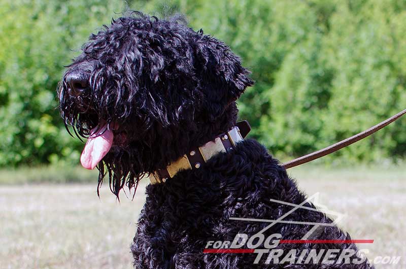 Wide Leather Black Russian Terrier Collar decorated with studs and plates