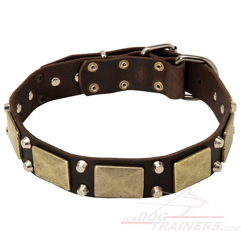 This Leather Collar is a real masterpiece. It's decorated with brass plates and nickel-plated cones. The design of the Collar accentuates your dog's strength, muscles and nobility. You dog won't be left without curious and admiring looks when walking or training. This Awesome Leather Collar is now available to provide your dog with high-quality and super dog equipment!