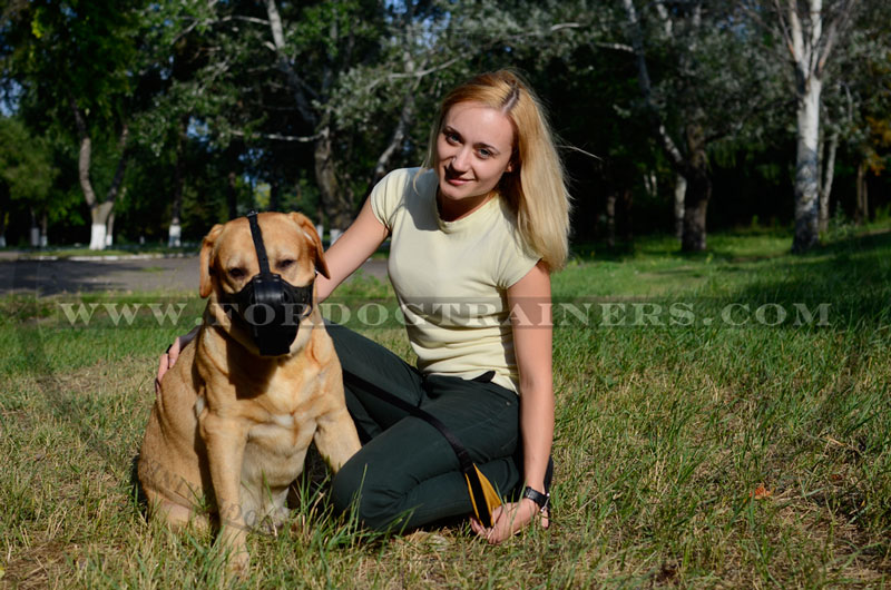 Labrador Dog Sitting with Our Training Leather Muzzle on